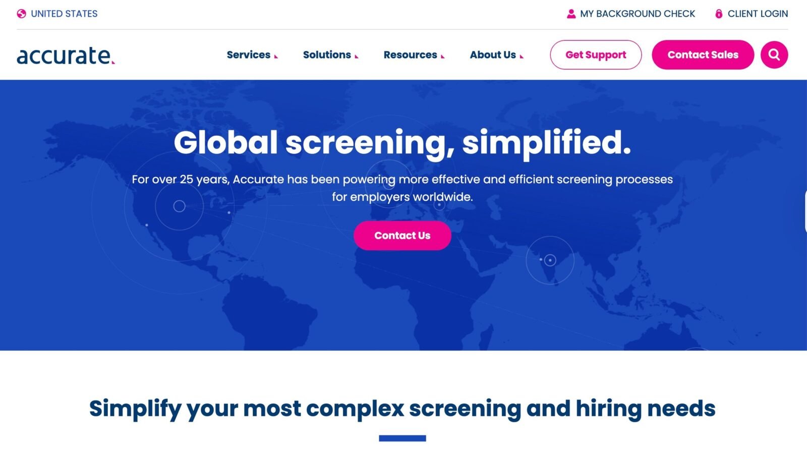 شركة أكوريت، المعروفة أيضًا باسم Accurate، أصبحت واحدة من أكثر الشركات موثوقية وسمعة في مجال فحص خلفيات الموظفين. على مدى السنوات، بنت سمعة قوية في تقديم فحوصات خلفية سريعة ومتوافقة وآمنة للشركات من جميع الأحجام. عملاؤها يتنوعون بين شركات متوسطة الحجم وشركات عالمية تتطلب عمليات توظيف قانونية وموثوقة.